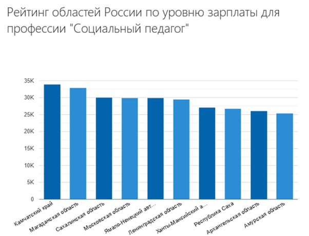 Зарплата социального педагога в России — 18 777 ₽ в месяц. В Москве она достигает 40 391 ₽, в Новом Уренгое — 35 750 ₽, в Южно-Сахалинске — 27 124 ₽.
